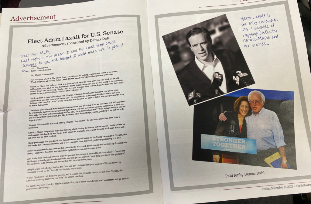(Chuck Muth) – In response to my response to Republican U.S. Senate candidate Adam Laxalt/Demar Dahl’s full-page “Chuck Schumer” letter/ad in the Fallon Post, a number of readers have weighed in. A sampling (names withheld to protect the innocent from retaliation) … “The letter strikes me as something you might expect from a spoiled, ‘pouty’ […]