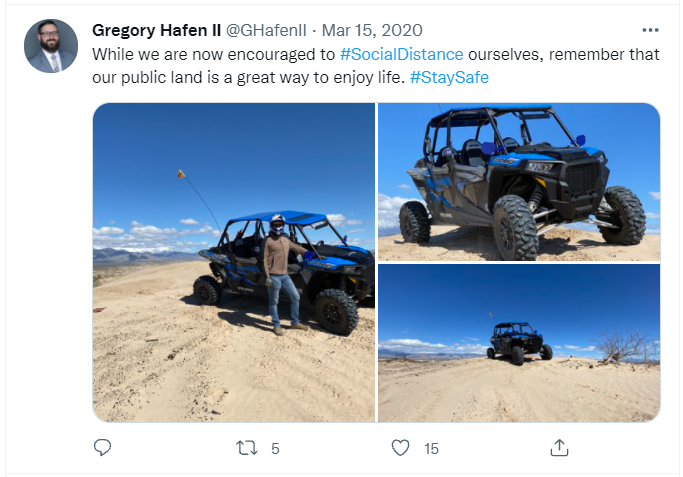 In the early days of the Sisolak Shutdown, Hafen was busy posting selfies of himself on social media tooling around the Nevada desert in his off-road four-wheeler and having the time of his life.