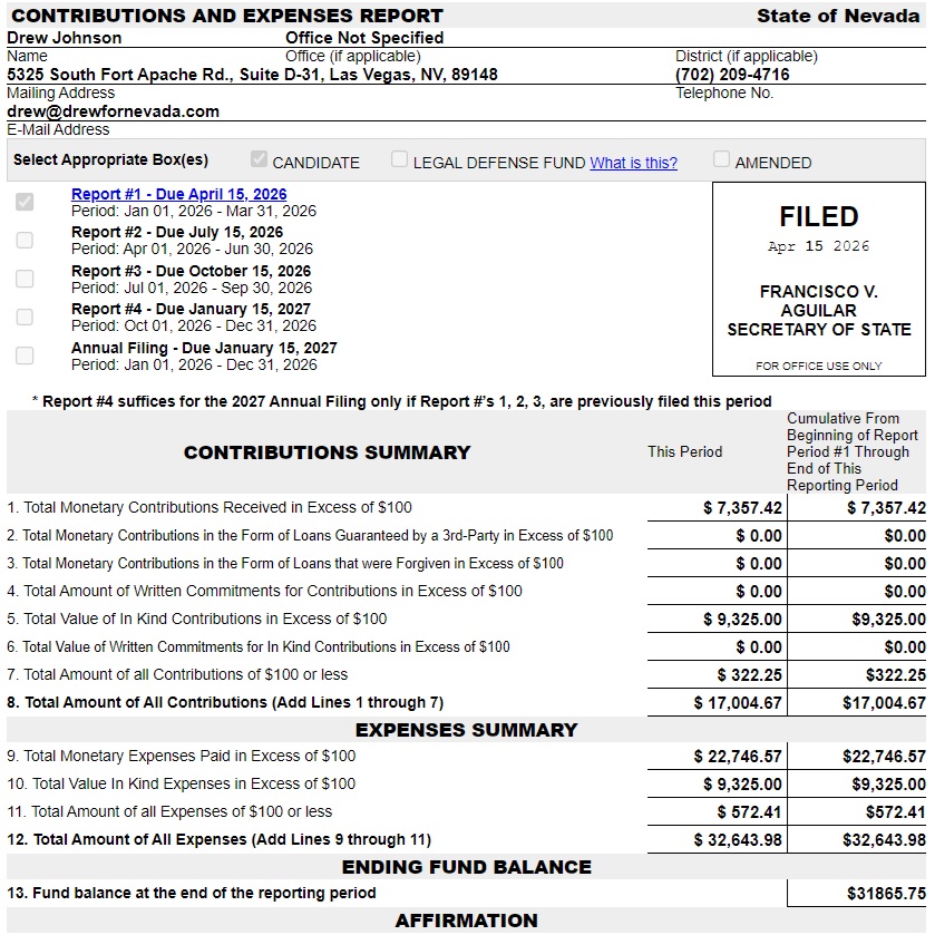 But a funny thing happened on the way to the coronation. Drew was forced to report his contributions and expenses this week.