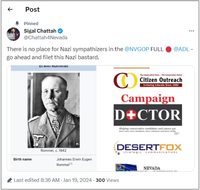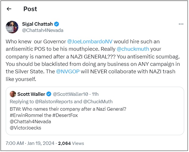 “Who knew our Governor @JoeLombardoNV would hire such an antisemitic POS to be his mouthpiece. Really @chuckmuth your company is named after a NAZI GENERAL??? You antisemitic scumbag. You should be blacklisted from doing any business on ANY campaign in the Silver State. The @NVGOP will NEVER collaborate with NAZI trash like yourself.”
