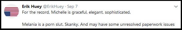 • “For the record, Michelle (Obama) is graceful, elegant, sophisticated.  Melania (Trump) is a porn slut. Skanky.”